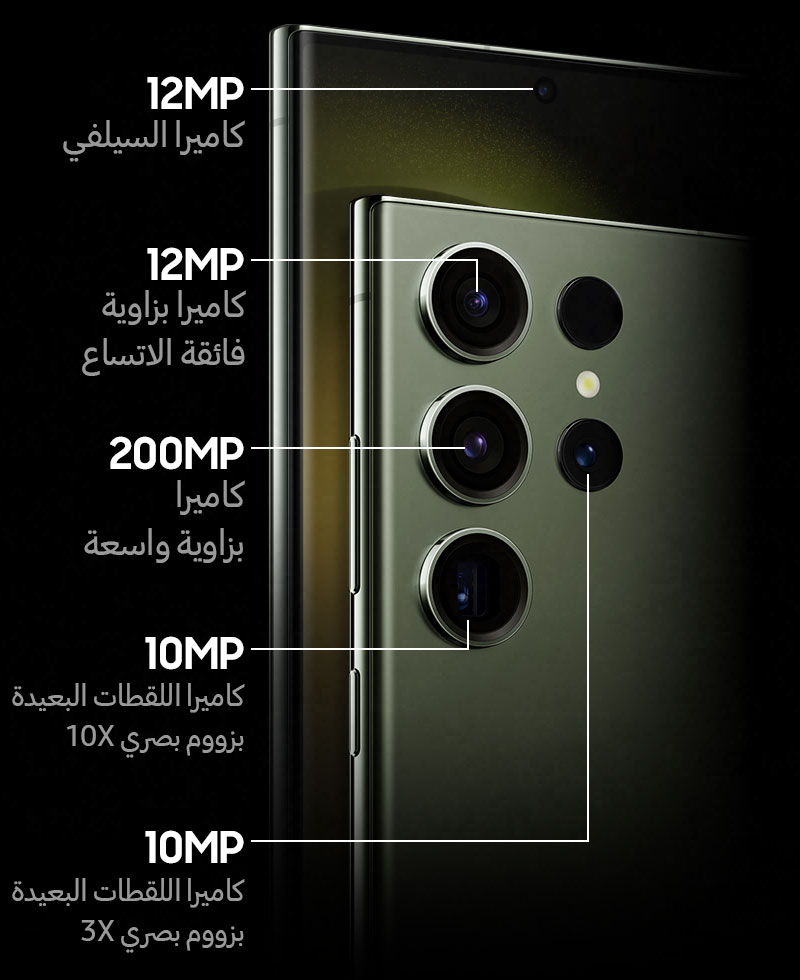 يتميز Samsung Galaxy S23 Ultra بشاشة 6.8 بوصة Dynamic AMOLED 2X بدقة عالية ومعدل تحديث 120Hz، مع معالج Snapdragon 8 Gen 2 for Galaxy القوي، ونظام كاميرا خلفية رئيسي بدقة 200 ميجابكسل مع قدرات زوم متقدمة، وبطارية بسعة 5000 مللي أمبير تدوم طويلاً، مع دعم القلم S Pen، وهيكل من الألمنيوم وزجاج Gorilla Glass Victus 2، ومقاومة للماء والغبار بمعيار IP68.